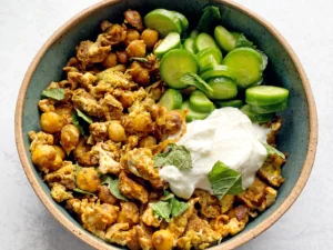 - Indian Masala Chickpea Scramble (vegan option): Sauté canned chickpeas with spinach, onion, turmeric, cumin, and garlic in olive oil. Scramble 2 eggs or use tofu. Top with fresh cilantro and lemon. (High-protein, gut-friendly.)